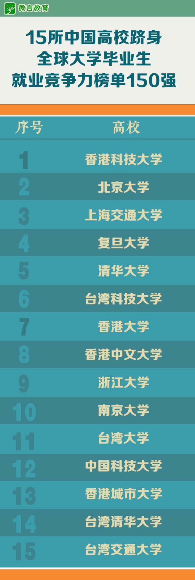 11月16日,英国《泰晤士报高等教育》发布2017年全球大学毕业生就业竞争力排行榜。中国共有15所高校跻身该排行榜150强,其中7所来自中国大陆,中国香港和中国台湾地区各有4所上榜,入选学校数量和排名较去年均有所提升。具体都是哪些高校?小编带大家一起看↓↓↓