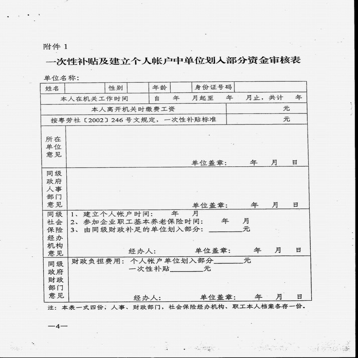 根据《转发劳动和社会保障部等四部门关于职工在机关事业单位与企业之间流动时社会保险关系处理意见的通知》(粤劳社[2002]246 号)有关规定,现就一次性补贴及建立基本养老保险个人帐户(以下称个人帐户)中单位划入部分资金申请、审核和划拨的有关事项通知如下: