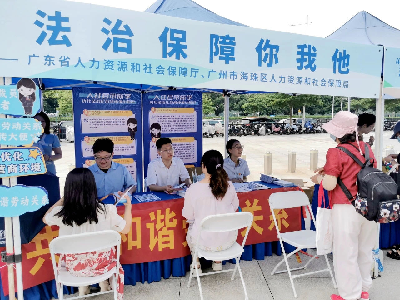 在企业劳动用工法治体检服务专区,由广州市海珠区人力资源和社会保障局工作人员现场为企业提供一对一劳动用工法治体检服务,受到了众多企业欢迎。劳动用工法治体检是广州市海珠区人力资源和社会保障局创新打造的小微企业劳动关系事务托管项目的服务内容之一。近年来,海珠区人力资源社会保障局聚焦标本兼治,创新双线普法同步发力,最大限度地增加和谐劳动关系因素,不仅建立了党员普法志愿者、青年仲裁员志愿者2支普法专业队伍,还组建了“劳动关系首席服务官+和谐劳动关系使者团+劳动争议观察员”共379人多元普法团队,打造了“亲临现场、湾区劳动法学堂、专家访谈、以案说法、使者带你读法条”等五大普法品牌;创新打造小微企业劳动关系事务托管服务项目,从源头上解决小微企业劳动关系多发、易发、频发的顽疾,已加入托管小微企业劳动争议未再发生劳动争议率达89.34%。率先在全国上线首个188金宝博 数字服务平台“海珠188金宝博 一点通”,实现精准普法;积极培育和谐劳动关系单位,辖内广州塔旅游文化发展股份有限公司获评“全国和谐劳动关系创建示范企业”;海珠区劳动关系综合服务中心获评“第一届全国和谐劳动关系创建工作先进集体”。