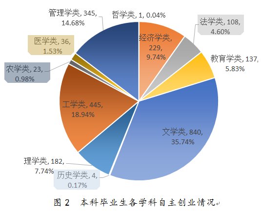 2015年本科各学科毕业生中,文学类专业毕业生自主创业最多,有840人,占本科毕业生自主创业人数的35.74%。哲学类只有1人自主创业。