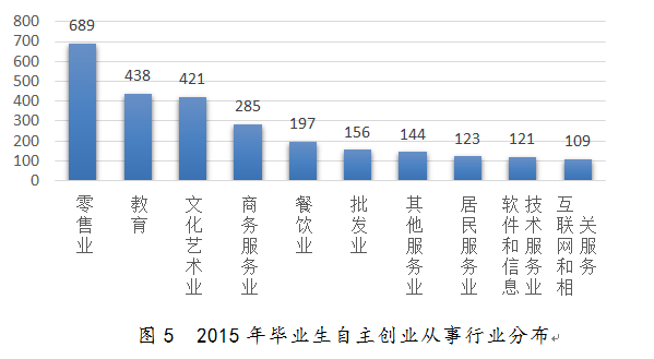 2015年自主创业毕业生中,选择零售业创业的毕业生最多,有689人,占自主创业毕业生人数的18.77%;其次是教育,有438人,占11.93%;第三是文化艺术业,有421人,占11.47%。